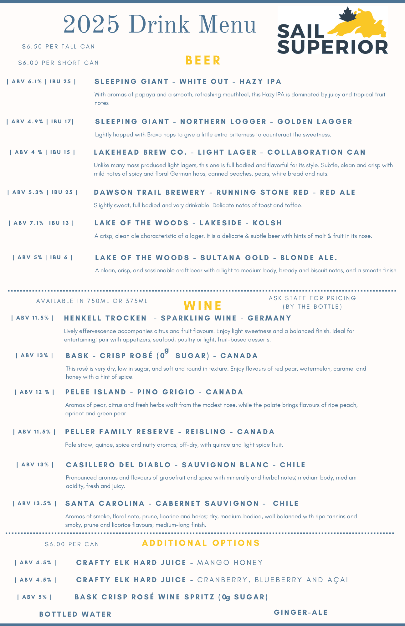 *Alcohol is not included in the tour price. Wine and local craft beer can be purchased onboard. BYOB is prohibited. View Drink Menu