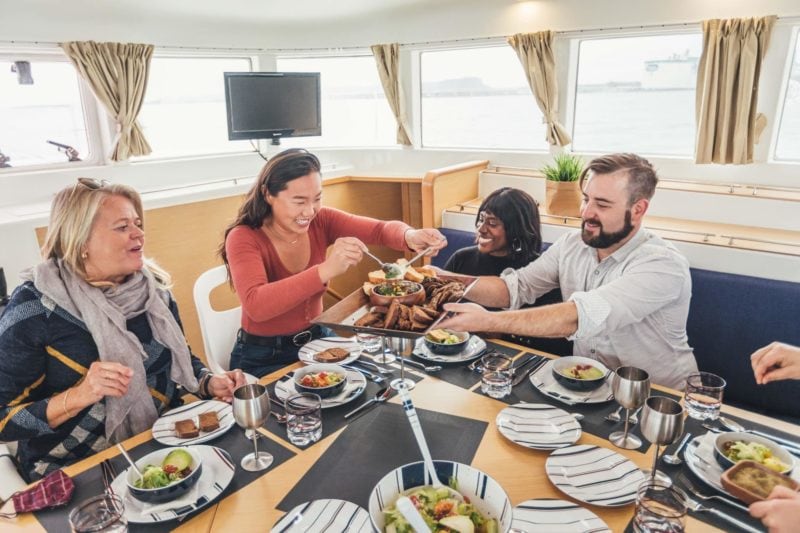 A selection of catering and self-catering options available, choose an add-on to suit any sailing tour. If you'd like to provide the meal yourself, a $100 service fee includes dishes, cutlery and clean up. If you'd rather a catered event, take a look at our partner companies to choose your meal today!Â